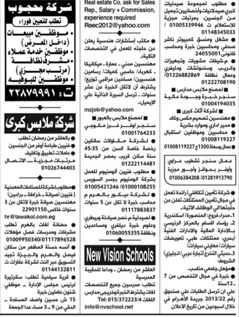 وظائف جريدة الاهرام 23/5/2013 - وظائف مطاعم خمس نجوم - وظائف شركة مقاولات رائدة فى الدوحة قطر - وظائف لعدد من التخصصات للعمل فى المملكة العربية السعودية - وظائف مجموعة شركات كبرى - وظائف مدرسة فرنسية - وظائف شركة سياحة كبرى - وظائف جريدة الاهرام اليوم - مديرة منزل - شيف عمومى - مندوبين تسويق - وظائف قطر - وظائف الدوحة - وظائف شاغرة فى قطر - مهندس مدنى - محامين نقض - محامين استئناف - موظفين شئون ادارية - وظائف شاغرة فى السعودية - وظائف بالسعودية - سائقين - مدير مشروع - مدير نظافة - مشرفين - محاسب - سيرفيس - تجهيز وتحضير لمطعم - اشراف داخلى - barman - caption - waiter busboy stewards - house keeping